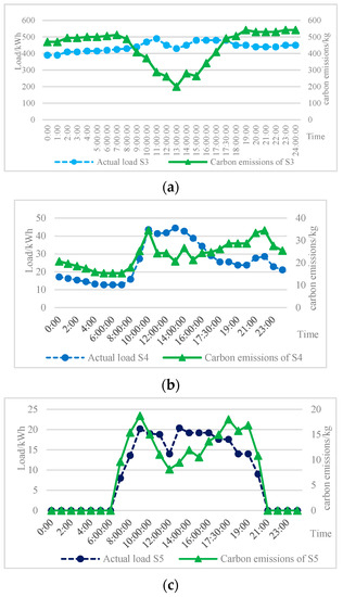 From Figure 7, during the period from 18:00 to 8:00, the carbon emissions of each load are proportional to the load as there is only an inflow of thermal power. During the period from 8:00 to 18:00, the carbon emissions of each load decrease because of the inflow of photovoltaic electricity. This shows that carbon emissions change over time and that clean energy does play a role in carbon emission reduction, which is conducive to enhancing consumers’ awareness of carbon reduction.