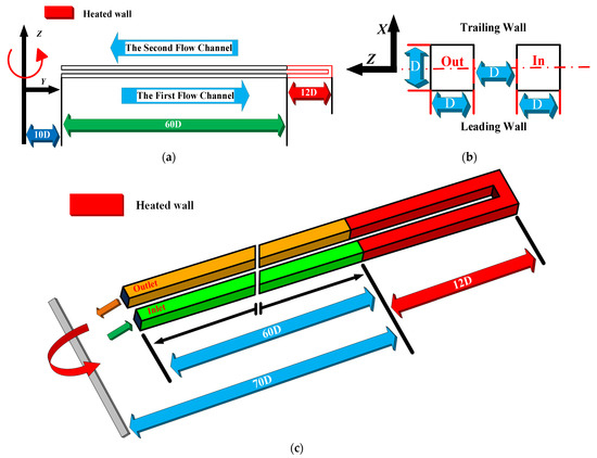 Sun et al. [39] designed a power generation turbine with an output power greater than 100 kW according to the incoming air temperature and pressure of the hypersonic vehicle. The turbine blade height and width are both 14 mm. In this paper, the cooling channels are modeled according to the experimental setup employed by Han et al. [10] and according to the blade dimensions of the power generation turbine of a hypersonic vehicle. The structure of the cooling channels is illustrated in Figure 1. The channel cross section is square, and its side length is D = 1 mm. The non-heating section length is set to 60 D. The U-shaped cooling channel heating section length is 12D.