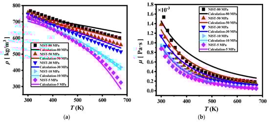 The data obtained using the calculation formula and the data in the literature [43] are compared and analyzed to obtain the curve shown in Figure 2. As seen in Figure 2, the calculated data are basically consistent with the trend of NIST. The accuracy of the physical property calculation method fulfills the requirements for the investigation of the heat exchange performance of the fuel under rotating conditions.