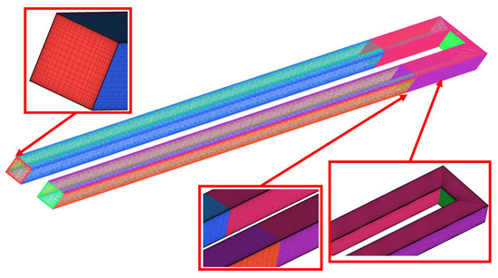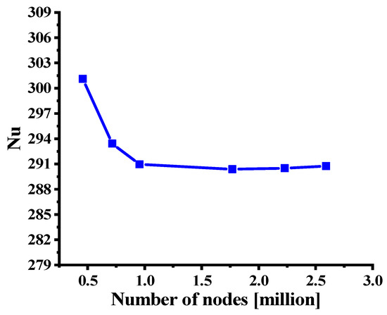 The ICEM software is used to mesh the channels. The thickness of the first layer of the grid is 0.0001 mm and the growth rate of the grid is 1.01. The grid details of the channels are obvious when observing Figure 4. The grid independence verification is performed for the inlet temperature of 590 K and rotational speed of 30,000 rpm to save computing resources. Figure 5 depicts the Nusselt number curve. The Nusselt number changes very little when the number of the grid nodes is greater than 0.95 million. In order to save computing resources, a scheme with a grid node number of 2,229,057 is finally selected for calculation. The y+ of the computational grid is 0.36, which satisfies the demands of the turbulence model.