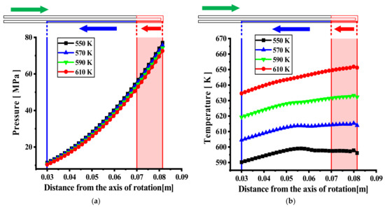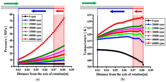 Temperature and pressure distribution along the center line at 60,000 rpm. (a) Pressure; (b) temperature.