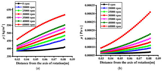 Distribution of physical properties along the centerline at 60,000 rpm. (a) Density; (b) dynamic viscosity.