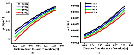The distribution of physical properties at the centerline at an inlet temperature of 590 K. (a) Density; (b) dynamic viscosity.
