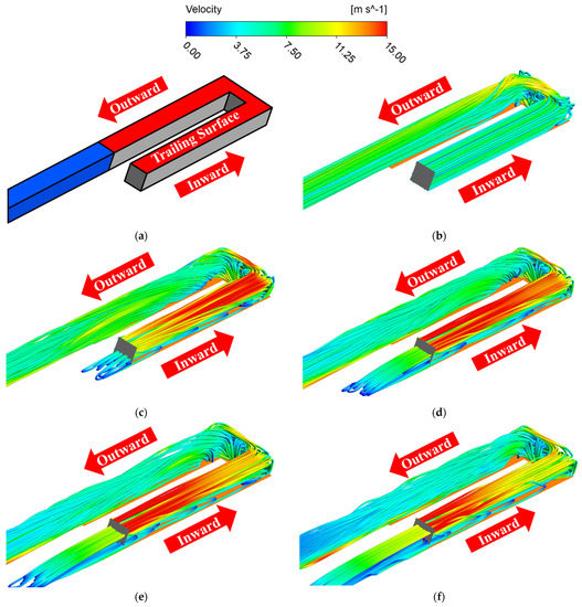 Effect of rotational speed on hydrocarbon fuel flow velocity at 590 K. (a) The model trailing surface position; (b) 0 rpm; (c) 20,000 rpm; (d) 30,000 rpm; (e) 40,000 rpm; (f) 60,000 rpm.