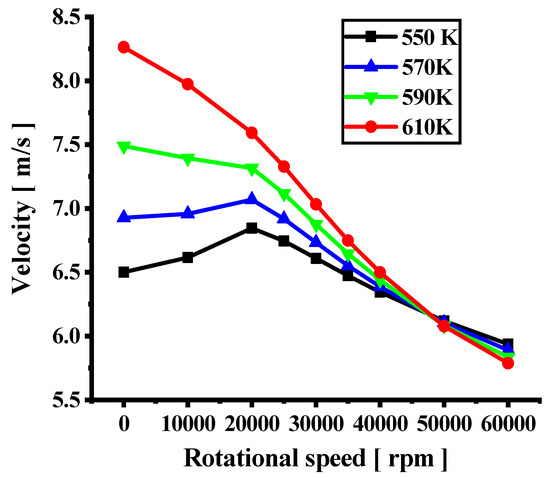 The volume of the average flow velocity significantly decreases in the heating section with an increase in the rotational speed, as shown in Figure 11. The high pressure under rotating conditions leads to an increase in physical properties, making the velocity decrease significantly. The reduced velocity makes the flow within the boundary layer weaker, leading to a decrease in the thermal exchange capacity. The velocity increases with the increasing inlet temperature for rotational speeds of < 40,000 rpm. This indicates that the flow velocity of the fuel is affected by the force and change in the physical properties in the rotating state.