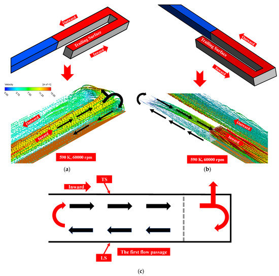 It can be observed in Figure 12 that the fuel near the LS location of the first flow passage in the rotating state will form a backflow. The phenomenon of countercurrent flow is enhanced with an increase in the rotational speed. The fuel flow direction is bifurcated due to the blocking effect of the wall surface. When the fuel near the TS flows into the area of the turning section of the passage, a part of the fuel flows into the second flow channel along the channel, while the other part of the fuel turns 180° and flows in the inlet direction of the U-shaped channel along the LS. The fuel near the LS turns 180° and flows to the TS in the inlet area corresponding to the heating section due to the high velocity fluid drive in the main flow area. This creates a fuel flow cycle, which is shown in Figure 12c. It is obvious that the velocity is higher in the first flow passage and the turning area, so the first flow passage and the turning location have the strongest heat transfer capacity.