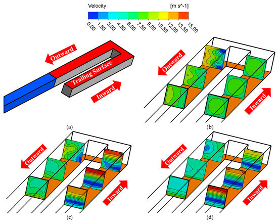 Velocity distribution of the channel cross-section at an inlet temperature of 590 K. (a) The model trailing surface position; (b) 590 K, 0 rpm; (c) 590 K, 25,000 rpm; (d) 590 K, 60,000 rpm.