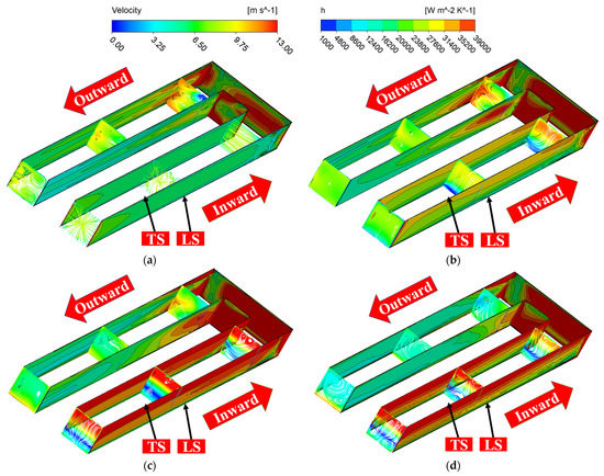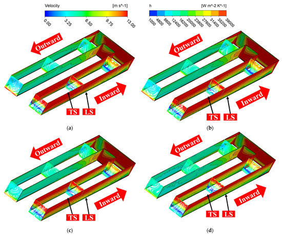 As seen in Figure 14, the region of high velocity area near the TS corresponding to the first flow passage first rises and then falls when the rotational speed increases. Meanwhile, the area of the high convection heat transfer coefficient region rises and then falls with an increase in the rotational speed. The trend of the h near the TS of the first flow passage depends on the change trend of the fuel velocity. The fuel in the first runner moves significantly towards the trailing surface due to the Coriolis force under rotating conditions. However, when the rotational speed is low, the effects of the density and dynamic viscosity are less than the effect of the Coriolis force. Under the action of the Coriolis force, the velocity of the first runner near the trailing surface is increased, thus enhancing the heat exchange effect. When the rotational speed is higher, the effect of rising fuel properties is greater than the effect of the Coriolis force. This reduces the region of high velocity near the TS of the first flow passage, which, in turn, causes a decrease in the thermal transfer effect.