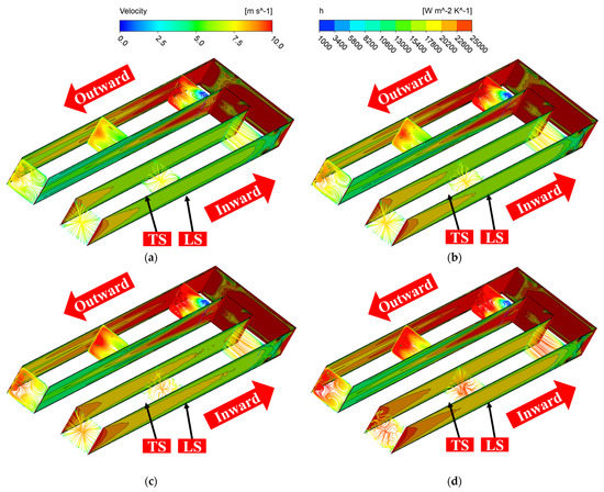 Streamline and h distribution of heating section. (a) 590 K, 0 rpm; (b) 590 K, 10,000 rpm; (c) 590 K, 25,000 rpm; (d) 590 K, 60,000 rpm.