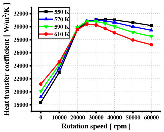 It can be observed from Figure 17 that h initially increases and then decreases with an increase in the rotational speed. In the rotating state, the increase in the fuel density and dynamic viscosity lead to a significant decrease in the overall velocity of the heating section. However, the fuel in the first runner under rotating conditions flows to the trailing surface under strong Coriolis forces. This significantly increases the fuel flow velocity near the TS region of the first channel. This promotes violent mixing between fluids, which enhances the heat exchange. The effects of the increasing density and viscosity are less than the effects of the Coriolis forces for entrance temperatures of 590 K and 610 K at speeds below 25,000 rpm. At this point, the flow velocity of the first runner near the TS increases gradually with an increase in the rotational speed, which contributes to a gradual increase in h in the rotational speed range of less than 25,000 rpm. At rotational speeds higher than 25,000 rpm, the decrease in velocity caused by the rise in density and dynamic viscosity has a greater effect than the rise in the flow velocity caused by the Coriolis force. Therefore, the flow velocity in the first flow channel near the TS gradually decreases with an increase in the rotational speed. This results in a gradual decrease in h in the rotational speed range above 25,000 rpm. It can be observed from Figure 17 that the h increases with an increase in the inlet temperature for rotational speeds of less than 10,000 rpm. The h decreases with an increase in the inlet temperature at rotational speeds higher than 30,000 rpm. Between 10,000 rpm and 30,000 rpm is the transitional rotational speed.