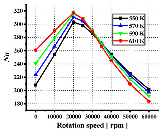 The trend of Nusselt number with rotational speed and temperature.