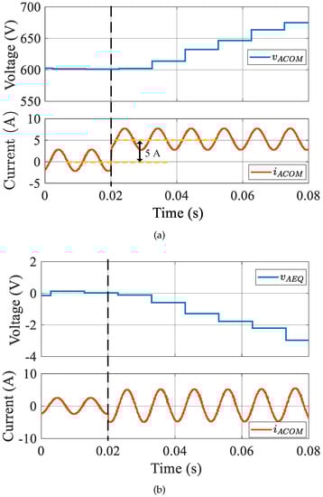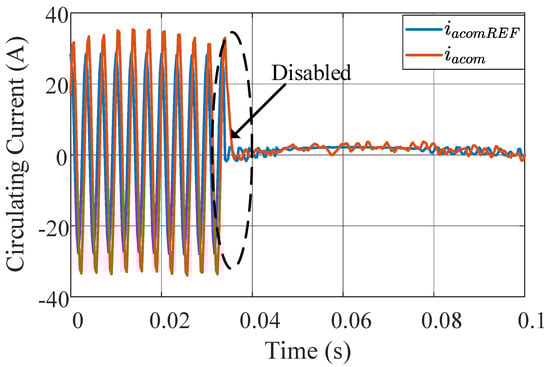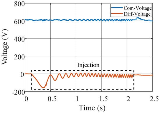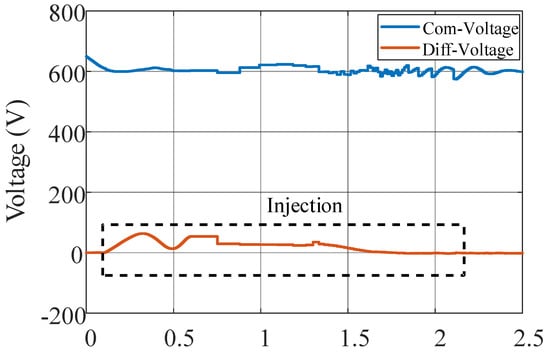 To validate the proposed differential mode energy model, the AC component of the injected circulating current is used as an example for the illustration. As shown in Figure 4b, when increasing the AC component at s, the increases, the circulating current also increases, and the differential mode voltage gradually decreases. It proves that the differential mode energy can be adjusted by in a low-frequency mode.