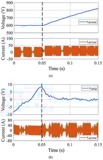 Figure 3 shows the common mode voltage and differential mode voltage waveforms in high-frequency modes. As shown in Figure 3a, when s, the DC component of the circulating current increases by 5 A. According to (13), the circulating current also increases, which results in an increase in the common mode voltage . Therefore, the common mode energy can be adjusted by the DC component of the circulating current in a high-frequency mode.
