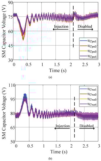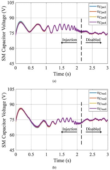Figure 7 shows the positive SM capacitor voltage waveforms with energy balance control. In the initial stage, the SM capacitor voltage is in a stable state with the energy controller. After 0.1 s, the energy controller is disabled and the SM capacitor voltage gradually becomes unstable. When s, the SM capacitor energy balance controller restarts, and the SM capacitor voltage quickly returns to a steady state. It proves that the controller can ensure the balance of the SM capacitor.