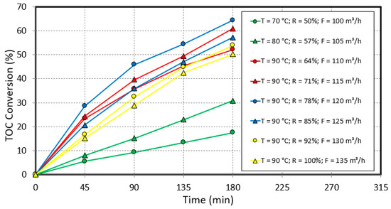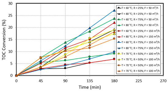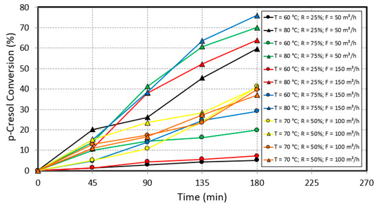 Figure 2 and Figure 3 illustrate the time evolution of p-cresol and TOC conversions, respectively, under the investigated experimental conditions. The results obtained at different temperatures (60 ≤ T ≤ 80 °C) for a reaction time of up to 180 min show the great influence of this independent variable on both responses, with the highest conversions of p-cresol (76%) and TOC (27%) being achieved at the highest temperature (80 °C) using R of 75% and F of 150 m3/h, respectively. To better elucidate the influence of R and F, a statistical analysis of the results from this experimental design was performed using the Statistic 8.0 software, by comparing the combined effects of these variables.