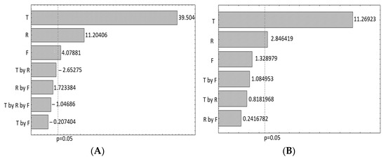 Pareto charts of linear and combined effects of independent variables, namely (1) temperature (T), (2) molar stoichiometric ratio of p-cresol/hydrogen peroxide (R), and (3) air flowrate (F) on: (A) p-cresol conversion; (B) TOC conversion. Runs were carried out for a reaction time of 180 min according to the 23-full factorial design outlined in Table 1.