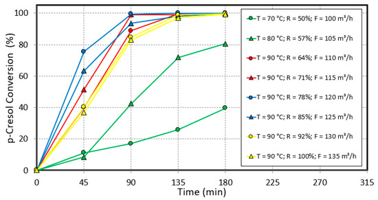 The results of Table 5 and Figure 5 show that p-cresol conversion reached very high levels in runs 3 to 8. As the difference among p-cresol conversions in these runs was very small, it was considered that optimization of p-cresol oxidation was already achieved under the reaction conditions of run 3 (T = 90 °C, R = 64%, and F = 110 L h−1).