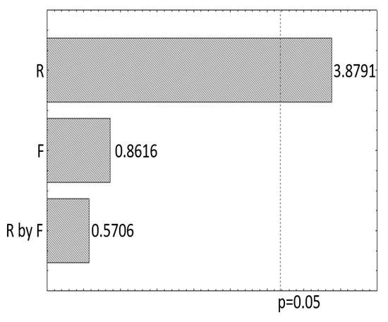 Pareto chart of linear and combined effects of independent variables, namely (1) molar stoichiometric ratio of p-cresol/hydrogen peroxide (R), and (2) air flowrate (F) on TOC conversion. Runs were carried out for a reaction time of 180 min according to the 22-factorial design outlined in Table 3.
