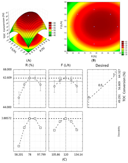 According to the Pareto chart of linear and combined effects of R and F on TOC conversion (Figure 7), only the effect of the former independent variable was statistically significant. Since the lack of fit to the linear model was significant, the quadratic model was able to fit the experimental data, which means that the inflection point of the curve (optimal conversion point) should have been around the center point. Therefore, a Rotational Central Composite Design (RCCD) was additionally adopted (Table 4), in which the axial points determined with the Statistic 8.0 software were added, together with an additional central point run, to the runs of the 22-factorial design (Table 3).