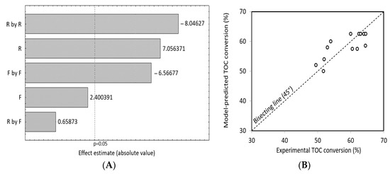 For this purpose, the Pareto charts of Figure 4A,B illustrate the dependence of the p-cresol and TOC conversions, respectively, on the selected process variables, in a 95% confidence interval. In particular, it can be seen that all three independent variables exerted statistically significant influences on p-cresol conversion, whereas only T and R did so on TOC conversion. On the other hand, second and third order interactions between variables did not statistically significantly influence both responses.
