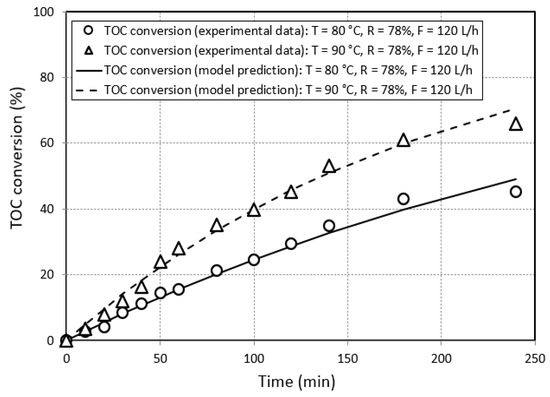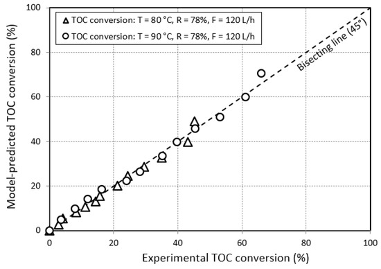 TOC conversion values predicted by the model (Equation (22)) versus those experimentally determined. T = temperature, R = stoichiometric ratio p-cresol/hydrogen peroxide, F = air flowrate.