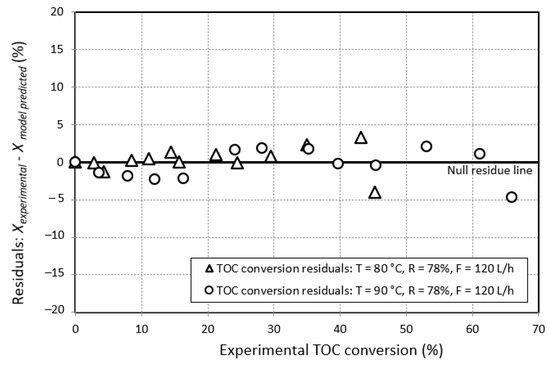 Residuals for the TOC conversion according to Equation (22). T = temperature, R = stoichiometric ratio p-cresol/hydrogen peroxide, F = air flowrate.