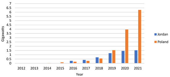 Cumulative installed solar capacity in Jordan and Poland. (Source: [6]).