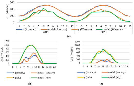Model fit visualization: (a) monthly time series for Amman and Warsaw (2019–2020); (b) hourly time series—Amman (31st of January and July); (c) hourly time series—Warsaw (31st of January and July).