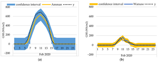 Analysis of the data presented allows the models to be used for monthly and hourly data during the summer months. Figure 8 presents forecasts for 2020 February 1st with a confidence interval based on hourly time series of (a) Amman and (b) Warsaw together with the observed values. Similarly, Figure 9 shows forecasts for 2020 August 1st with a confidence interval of 95%. It is worth noting the significant differences in the width of the confidence intervals.
