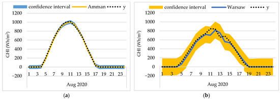 Forecasts for 2020 August 1st with confidence interval (95%) based on hourly time series of (a) Amman; (b) Warsaw.