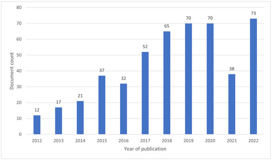 This subsection presents in more detail the steps taken during the systematic review and the statistical results obtained. For both stages, only one filter was applied in order to provide a larger collection of contributions. More specifically, the results were restricted to the years 2012 to 2022 for a more recent perspective of the literature. The first research stage uses the string “Electric AND Vehicles AND Public Buildings” in the format presented in Table 1. As a result, a general perspective of the interactions between EVs and the grid is presented, where the scale of the environment evolves from small parking lots with solar panels to residential structures and buildings, and even some cases of larger buildings, with a focus on PBs. The initial obtained results on 10 May 2023 were a total of 1418 publications. After applying the timeline filter, the total of publications to be analyzed was 487, with its distribution over time being presented in Figure 3.