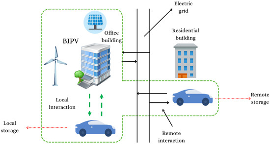 A novel concept called a “boundary expansion scenario” (BES) was featured in [65]. The approach intended to expand the interactions of EVs with a solar-wind-powered office building from the parking lot to a remote parking space, allowing the vehicles to continue participating in the system regardless of their location. The green thinner arrows indicated the location of the EVs in relation to the office building, while the green thicker arrows referred to the energy flow between the EVs and the building. Regarding the black vertical lines, they represented the grid, and the horizontal black arrows indicated the electricity flow. Finally, the green thinner dots around the buildings and the vehicles encompassed the whole proposed system. The control strategy was based on the TRNSYS simulation software, which is used for evaluating building energy systems and services, on-site renewable energy and storage systems, and various control systems, as well. Two scenarios were assessed (non-activated BES and activated BES), with 10 and 20 EVs in use, respectively. It was concluded that, with the BES activation, the matching of generation and demand reached 62%, and the coverage rate of the EV storage was 96.9%. Figure 5 shows the potential interactions between EVs and office and residential buildings.