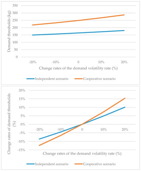 From Table 2 and Figure 2, nevertheless, the demand threshold shows an opposite trend for the change in the drift rate, , under different scenarios. That is, the investment timing is earlier as the drift in demand grows under the independent scenario, but this occurs the other way around under the cooperative scenario. As the drift reflects the expected growth rate, firm would be accelerated due to the larger growth rate of the demand if it invests independently. In the cooperative case, however, when the growth trend of the demand becomes lower, the investment timing for is advanced. This means that the lower the expected hydrogen demand is, the better the co-operative investment shows its advantage of risk sharing, though its investment timing is still later than that under the independent scenario. Another reason is since the expected growth rate of demand becomes higher, wants to claim greater benefit from . Accordingly, requires its payoff to be greater and has to wait more until choosing a higher investment threshold. Additionally, the sensitivity for the investment threshold is bigger under the cooperative scenario than that under the independent scenario, which means when the hydrogen market becomes more promising, potential investors have to delay their investment much later than usual if they depend on another actor to cooperate. Given that the hydrogen industry is developing rapidly, the optimal mode for firms is independent investment.