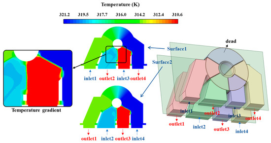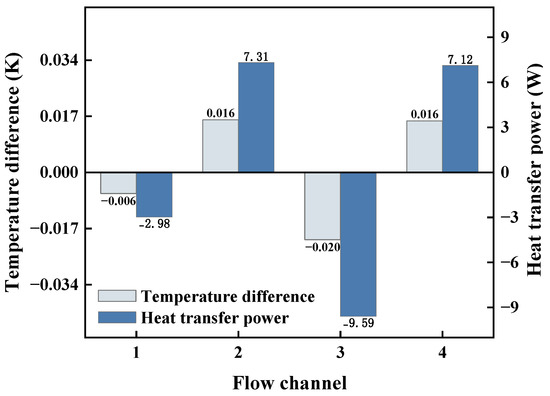 Figure 4 shows the temperature difference and the heat exchange power of each channel. It can be seen that the temperature difference in each flow channel is −0.006 K, 0.016 K, −0.020 K, and 0.016 K, and the heat exchange power is −2.98 W, 7.31 W, 9.59 W, and 7.12 W, respectively. When the temperature difference and the heat exchange power are positive, the coolant flowing through the flow channel absorbs heat, while heat is released when the temperature difference and heat exchange power are negative numbers. The temperature differences in flow channels 2, 3, and 4 are larger than that in channel 1. The coolant has a high specific heat capacity of about 2500 J/(kg·K) and a low thermal conductivity of about 0.28 W/(m·K). This shows that the temperature of the coolant changes slightly in the valve.