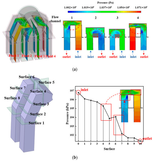 The pressure distribution of each channel is shown in Figure 5a. The pressure decreases constantly from inlet to outlet in four flow channels, and the pressure distribution is not steady around the control shaft, since the flow direction changes suddenly. A large pressure gradient can be observed at the control shaft. By distinguishing the colors of the pressure contours, the pressure drop between the inlet and outlet of each channel is different, with channels 1 and 4 exhibiting higher inlet pressure compared to channels 2 and 3. In order to define the regions where pressure loss mainly occurs, quantitative analysis was adopted. Taking flow channel 1 as an example, the pressure at each section is listed in Figure 5b. Section analyses were carried out before and after changes in the flow direction or cross-sectional area of the channels. The pressure drops between surfaces 4 and 5, as well as between surfaces 6 and 7 are large. The pressure drops in the two regions are 1411 Pa and 1883 Pa, and 25.8% and 34.47% of the total pressure drop, respectively. This indicates that the flow direction varies suddenly, resulting in an inhomogeneous pressure field. Moreover, a large loss of pressure occurs in the regions after the changes in flow direction.