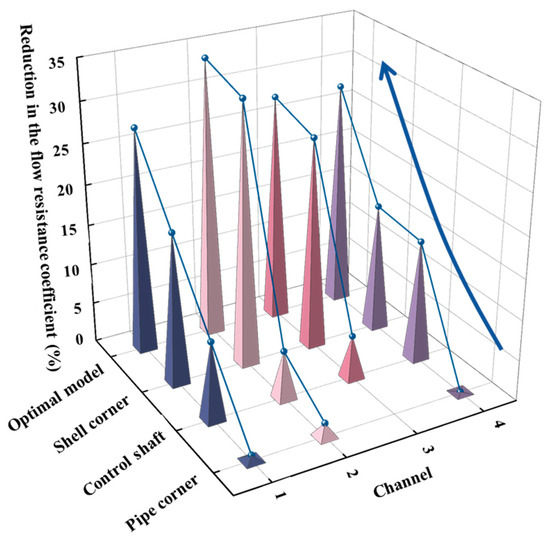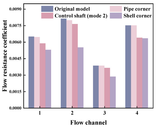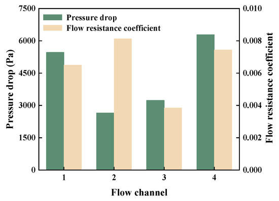As shown in Figure 6, the flow resistance coefficient of flow channel 2 is the largest, followed by that of flow channels 4 and 1, and the smallest is that of flow channel 3. The higher the flow resistance, the larger the pressure loss. Based on this, the pressure loss from large to small is flow channels 2, 4, 1, and 3. This phenomenon is different from that obtained by analyzing the pressure drop. Compared with the pressure drop, the flow resistance, as the evaluation index for pressure loss, is only related to the structure, eliminating the influence of flow velocity on pressure loss.