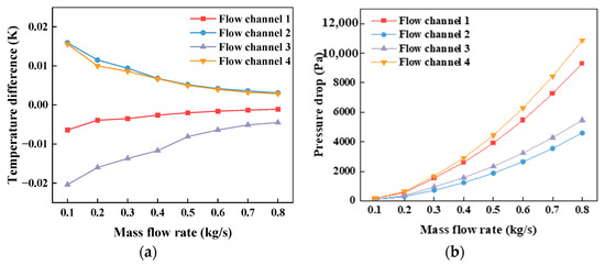 The effect of different mass flow rates on the temperature difference of the coolant in each channel is shown in Figure 7a. The temperature difference between the inlet and outlet decreases with an increase in the mass flow rate, and the rate of decrease in temperature difference slows down. Thus, a higher mass flow rate leads to a smaller temperature difference between the inlet and outlet and lower heat transfer loss. With a mass flow rate of 0.1 kg/s, the maximum temperature difference and heat transfer power are 0.02 K and 9.59 W, respectively. Equation (1) reveals that the temperature difference between the inlet and outlet is a function of the mass flow rate and the logarithmic mean temperature difference, with the same geometric structure and material of the valve. Since the change in logarithmic mean temperature difference is only 0.0002 K under different working conditions, the temperature difference between the inlet and outlet is only positively correlated with .