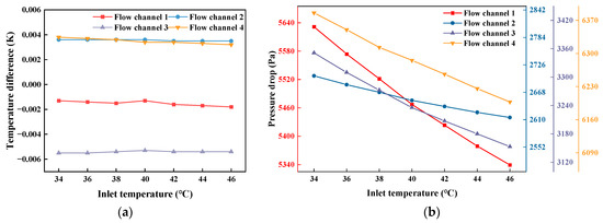 The temperature differences with the increase in the inlet temperature are shown in Figure 8a. As the inlet temperature rises, the temperature difference among different channels is insignificant, resulting in a slight change in heat transfer power. This implies that the inlet temperature has a negligible impact on heat transfer loss. Conversely, Figure 8b demonstrates the pressure drop in each flow channel with the increase in the inlet temperature. As the inlet temperature increases, the pressure drop declines continuously. The maximum pressure drops during the inlet temperature changing from 34 °C to 46 °C are 292.08 Pa, 88.14 Pa, 198.25 Pa, and 188.48 Pa, respectively, with pressure drops within this temperature range being 5.4%, 3.4%, 6.3%, and 3.0%. Specifically, the viscosity of the coolant decreases with the increase in coolant temperature. Consequently, an increase in inlet temperature leads to a decrease in pressure loss. However, the influence of inlet temperature on pressure loss is less significant compared to that of mass flow rate.