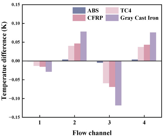 The temperature difference between the inlet and outlet using different valve materials is shown in Figure 9. The temperature differences are −0.005 K, −0.060 K, −0.070 K, and −0.119 K for ABS, TC4, CFRP, and gray cast iron at a mass flow rate of 0.6 kg/s, taking flow channel 3 as an example. The temperature difference increases accordingly, and this trend is also observed in other flow channels, resulting in an increase in heat transfer loss. Notably, gray cast iron has higher thermal conductivity than the other materials, leading to increased heat transfer through the valve. However, the temperature difference is not significantly different between the model with CFRP and TC4, due to the lower specific heat capacity of CFRP, despite the thermal conductivity of CFRP being 30% higher than that of TC4. Hence, materials with low thermal conductivity and high specific heat capacity should be used to minimize heat transfer loss. Furthermore, the pressure drops remain relatively constant despite changes in valve material. Valve materials have a negligible impact on pressure drop. Although the valve’s material can affect heat transfer in each channel, the temperature difference and change in viscosity can be neglected. Moreover, since the roughness of the sidewall is neglected in the numerical simulation, the valve materials cannot impact the friction pressure loss of the multiway valve.