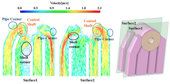 Given the negligible heat transfer loss in the multiway valve, the structural optimization focuses on minimizing pressure loss. The velocity vector distribution of the coolant inside the valve is shown in Figure 10. The vortexes in specific regions, including the pipe corners, control shaft, and shell corners, are revealed. Owing to the significant change in flow direction and flow cross-sectional area in these regions, there is a large pressure.