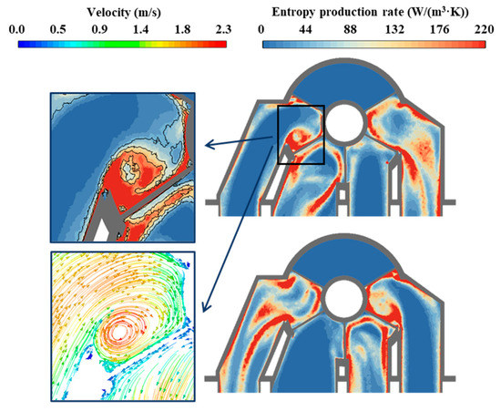 Since analysis on the regions generating pressure loss via the velocity field is insufficient, the entropy production analysis method was adopted in the present study to determine the specific regions of the energy loss. Entropy production is generated by irreversible processes and represents the irreversibility of the system and the resulting energy loss [37]. Moreover, it can be mathematically expressed as: