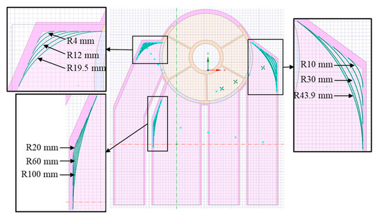 Flow channels 1, 2, and 4 contain pipe corners within their respective shells, leading to sudden changes in flow direction and cross-sectional area. Therefore, taking the adjacent walls as tangents and specifying the radius, the inner wall curves of flow channels 1, 2, and 4 are drawn and determined. The schematic diagram is shown in Figure 12, and the specific schemes are listed in Table 4.