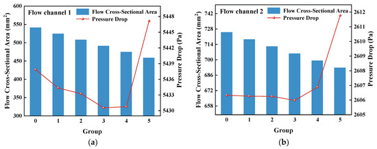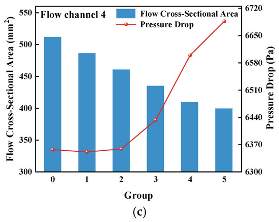 Pressure drops and flow cross-sectional area of flow channels: (a) flow channel 1; (b) flow channel 2; (c) flow channel 4.