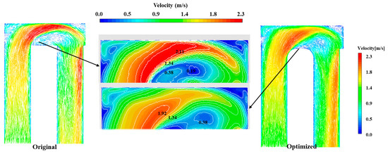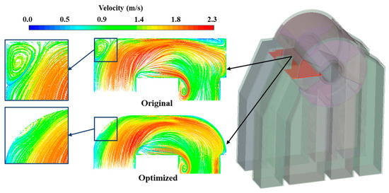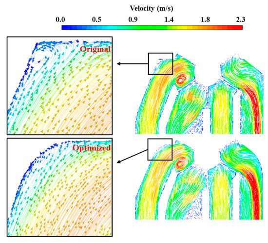 Figure 14 depicts the flow fields of both the original and optimized multiway valve models. The synergy between the wall shape and flow field resulting from structural optimization induces distinct weakened flow separation in the optimized model. Furthermore, the change in wall shape effectively stabilizes the flow field, which in turn reduces pressure loss. However, despite the improvements achieved using structural optimization, the pressure drop reduction remains relatively small. Further analysis of the velocity vector and entropy production rate distributions, as shown in Figure 11, reveals that the entropy production rate in the pipe corners is low, despite the presence of flow separation, compared with that of the regions at the control shaft. Consequently, the impact of structural optimization in these areas on overall valve performance is less significant.