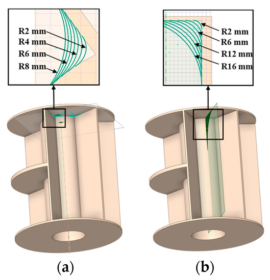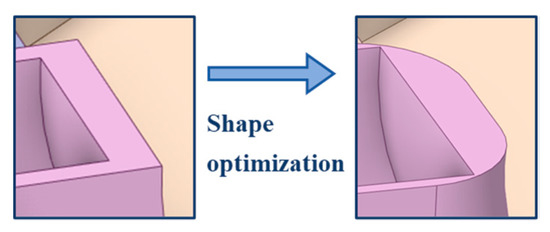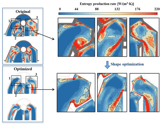 The entropy production rate of the section planes is shown in Figure 11. It is evident that the entropy production rate is high at the connection between the pipe of the shell and the control shaft. Furthermore, a comparison with Figure 10 reveals that the location where the velocity vector exists is characterized by a high level of entropy production. Therefore, the following structural optimizations mainly focus on the geometric optimization of the pipe corner, control shaft, and shell corner. Shape optimization was put forward to change the inner wall curves, where the flow direction and the flow cross-sectional area change, to make the fluid field steady without changing the appearance of the multiway valve. As the radius of inner wall curve increases, changes in flow direction and flow cross-sectional area slow down, and the flow characteristics are improved. However, the valve consists of three parts, which requires limiting the potential increase in inner wall curves to ensure that the curves do not exceed the junction of different parts.