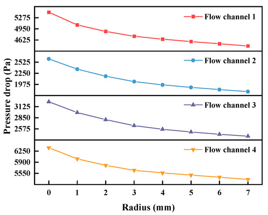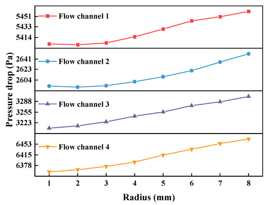 As the coolant flows from the inlet pipe to the control shaft, it undergoes a 90-degree rotation and experiences a sudden increase in flow cross-sectional area. This abrupt change in geometry creates vortices and contributes to the high entropy production rates observed in Figure 10 and Figure 11. Thus, structural optimization along radial and axial directions was proposed for the control shaft, as shown in Figure 15. The influence of the radius of the curve along the radial direction on pressure drop is demonstrated in Figure 16. The pressure drops in four flow channels increase as the radius increases. The maximum pressure drops increase by 57.36 Pa, 56.88 Pa, 96.52 Pa, and 115.29 Pa, respectively. Therefore, increasing the radius of mode 1 cannot reduce pressure loss, as it leads to a smaller flow cross-sectional area and a larger pressure drop compared with the original model.