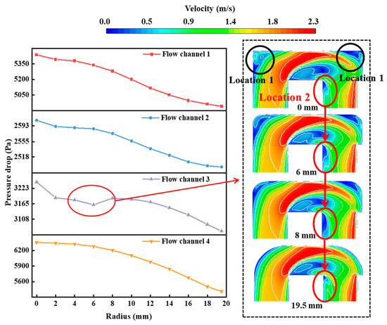 The impact of the radius of the curve along the axial direction on the pressure drop is shown in Figure 17. When the radii of curves are 19.5 mm, the pressure losses of each flow channel are minimized, with reductions in pressure drop of 496.55 Pa, 112.21 Pa, 181.40 Pa, and 946.39 Pa, resulting in an improvement in flowability of 9.13%, 4.31%, 5.59%, and 14.89%, respectively. Moreover, as the radius increases, the pressure drops of flow channels 1, 2, and 4 continue to fall, and the trends of the decreasing pressure drop slow down. However, the trend in flow channel 3 is different in that the pressure drop first declines, then rises as the radius rises from 6 mm to 8 mm, and finally declines again. Figure 17 shows the flow field of channel 3 with a radius of 0 mm, 6.0 mm, 8.0 mm, and 19.5 mm. The vortex in location 1 continues to decline as the radius decreases. Additionally, an area with low speed increases in location 2, when the radius changes from 0 mm to 8 mm. This phenomenon of flow separation intensifies when the radius changes between 6 mm and 8 mm. Although the vortexes in location 1 decrease, the pressure loss increases due to the intensified flow separation at location 2. However, if the radius continues to increase from 8.0 mm to 19.5 mm, the vortexes at location 1 and location 2 decrease, with the velocity gradient decreasing, and the flow field uniformity increases.