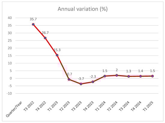 Annual inflation of energy goods prices. Source: processing data from the graph mentioned in: https://www.bnr.ro/Proiectii-BNR-22694-mobile.aspx, accessed on 26 April 2023 [6].