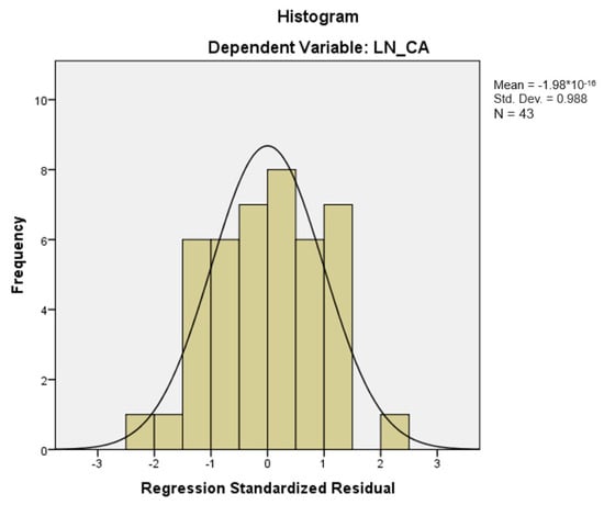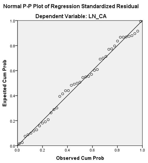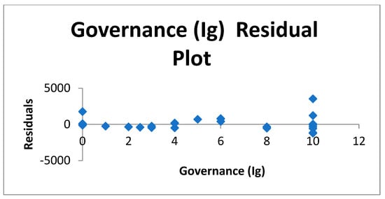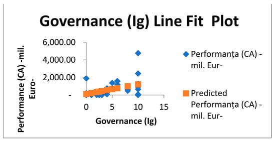 The slope parameter of the regression model (the coefficient of the explanatory variable Ig) is statistically significant for a significance level of 5%, showing that we can expect the company’s performance (turnover) to increase on average by EUR 111.13 million when improving the Governance Index by one scoring point (Table 6). Residual analysis with prediction error values and standardized error values is presented in Table 7. The probabilities are presented in Table 8. The residual diagram (Figure 2) and Line Fit Plots (Figure 3) allow analysis of the quality of the chosen model.