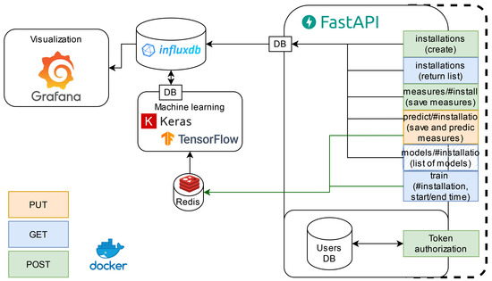 All the data can come from different sources, such as different IoT devices. The unique condition is to have a time stamp and the minimum data to make a correlation between all the inputs. This approach simplifies the process by consolidating all necessary information on a single platform and obviates the necessity for intricate and burdensome systems that entail an abundance of data. The details of the internal architecture are depicted in Figure 5. The platform uses docker to split the components into small modules that are easy to manage and maintain. To interact with the external elements and to receive the data, we created a REST API supported by the FasAPI framework. The machine learning element component uses the framework sckitlearn and keras. It uses the Redis database to receive the orders to perform prediction or re-training. To store the data, it uses Influx DB—a tool capable of managing time series data efficiently and sufficiently fast to hold all the needed data. Finally, the tool called Grafana can be used to visualize the data from the different sources and also the Digital Twin.